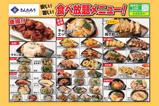 新ブランド「きんたろう」本厚木店でも食べ放題システムを導入。唐揚げや揚げ物はもちろん、半熟たまごがとろりと旨い「チャーシューエッグ」やいろいろな味を試せる餃子類、たくさんのおつまみ逸品、本格的な石焼ビビンバなどのお食事ものまで、全47品・2時間制の食べ放題を税込2980円でご提供します。