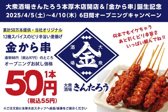 新ブランド「大衆酒場きんたろう」本厚木店とオリジナル唐揚げ「金から串」の新登場を記念し、本厚木店ではオープン6日間、キャンペーンを開催します。通常1本88円(税込97円)の唐揚げ「金から串」を、キャンペーン期間はなんと1本50円(税込55円)でご提供します。ピリ辛で旨い当社人気のオリジナル唐揚げを、ご来店のみなさまで食べつくす勢いで、オープニングキャンペーンを楽しんでください!