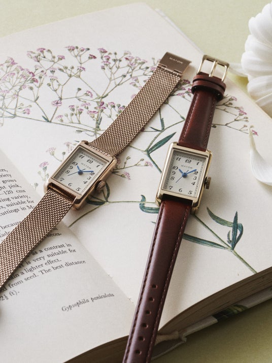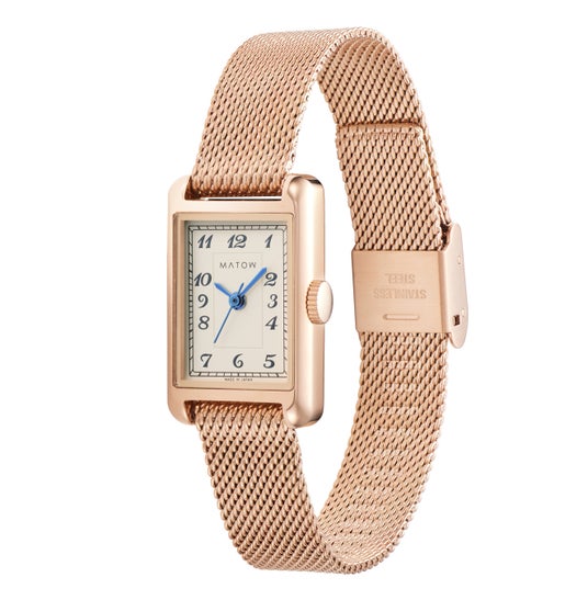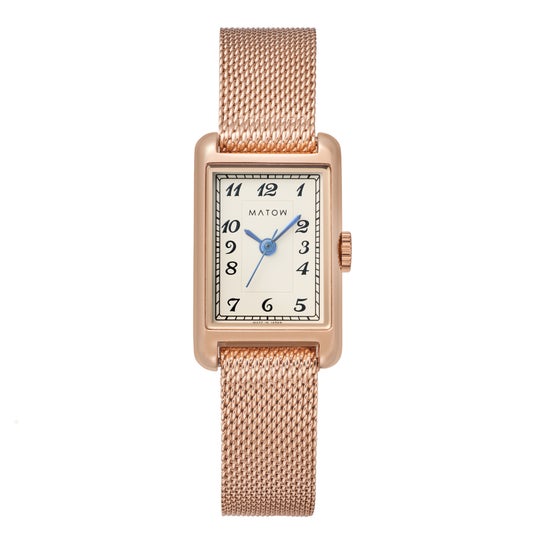 カラーバリエーションは、腕なじみの良いローズゴールドケースに、レザーバンドとメッシュバンドを合わせた2型をご用意。