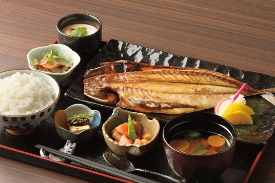 店内では、国産の食材にこだわり、干物を主役にした定食を提供しています。ガス釜でふっくらと炊き上げたご飯に、専用の焼き場でじっくりと焼き上げた干物を添えた、こだわりの一膳。皮は香ばしくパリッと、中はふっくらとした食感が特徴。