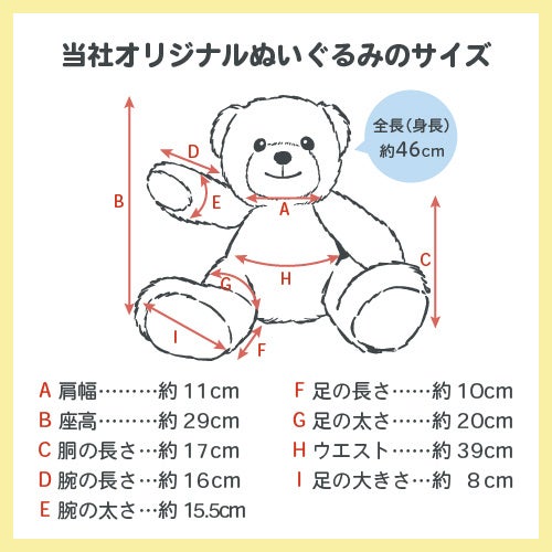 サイズ:全長(身長)約46 cm、肩幅約11cm、座高約29cm、胴の長さ約17cm、腕の長さ約16cm、腕の太さ約15.5cm、足の長さ約10cm、足の太さ約20cm、ウエスト約39cm、足の大きさ約 8 cm