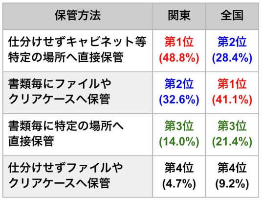 "書類保管用の場所"を決めておき、「仕分けせずキャビネット等特定の場所へ直接保管」する方法が関東で最も多く約5割、全国では第2位で約3割でした。