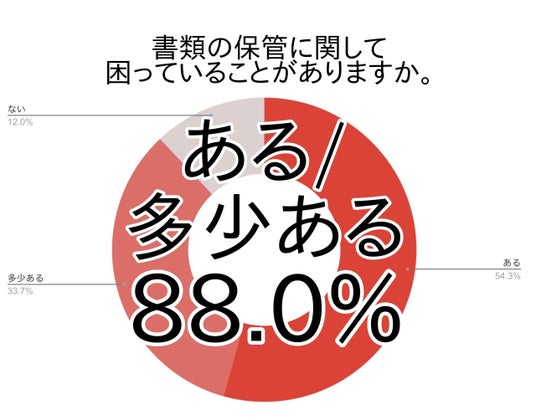 また、書類の保管スペースが場所を取っていると感じている方は約9割、書類の保管に関して困っていることがある方は約9割で、収納スペースの不足に悩む方が約7割でした。
