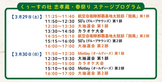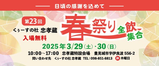 『至高の熟成を極める』忠孝酒造株式会社(本社:沖縄県豊見城市、代表取締役社長:大城 勤)は恒例の大人気イベント「くぅーすの杜 忠孝蔵 春祭り」を3/29(土)~30(日)に開催します。