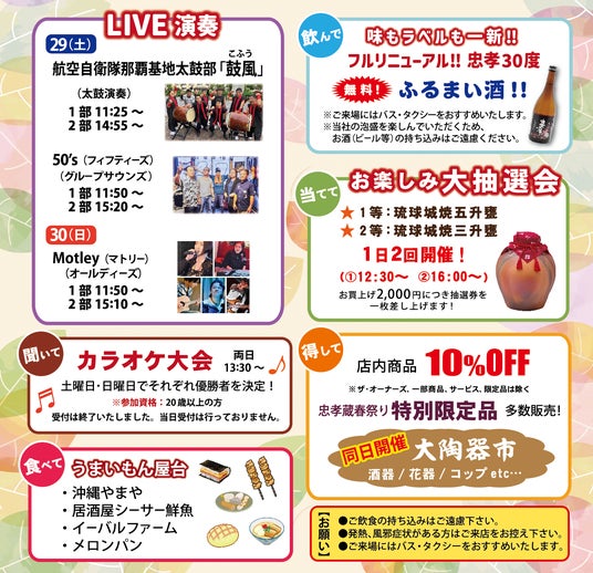 【入場無料!忠孝酒造の春祭り】3/29(土)~30(日)に沖縄・豊見城市で開催!無料のふるまい酒にライブ演奏、特別価格商品など見どころ満載。