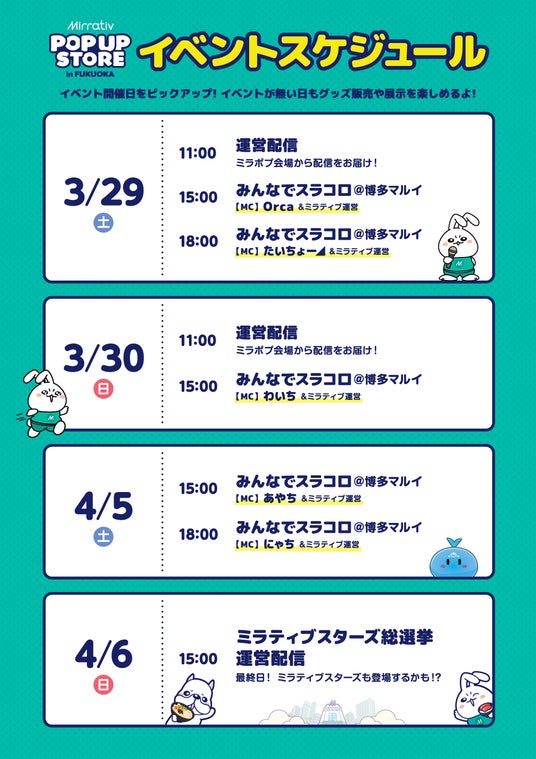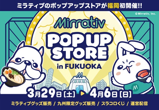 スマホゲーム配信者数で日本一※のゲーム配信プラットフォーム「Mirrativ(ミラティブ)」(以下Mirrativ)を運営する株式会社ミラティブ(本社:東京都目黒区 代表取締役:赤川隼一)は、ポップアップストアを博多マルイにて3月29日(土)~4月6日(日)の期間限定でオープンすることをお知らせいたします。