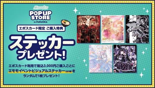 期間中、ポップアップストアにてエポスカードを利用してお買い物をすると、税込3,000円ご購入ごとに特典のエモモステッカー(全5種)をランダムで1枚プレゼントいたします。