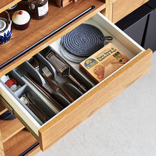 浅型の引出しにはカトラリーなど細々したものを、深型の引出しは保存瓶や水筒、ラップ、キッチンペーパーなどの重さや高さのあるものを収納出来ます。