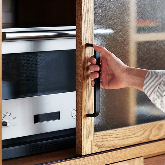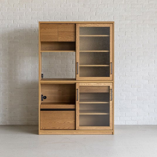 リバースの特長は、片側のみのスライド扉。扉を左右にスライドするだけで、「見せる」「隠す」収納を切り替えできます。扉にはデザインガラスを採用。光を通すため抜け感がありつつ、収納しているものはふんわりと分かる程度なので、生活感を抑えられるのも魅力です。