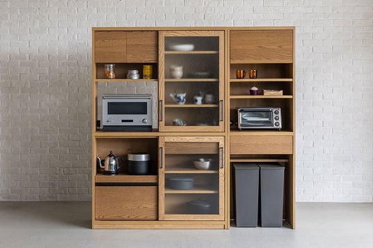 一台で完結できるため、都市部の狭小住宅や賃貸など、食器棚と家電収納ラックの両方を置くのは難しい、そんな方に使っていただきたい商品です。