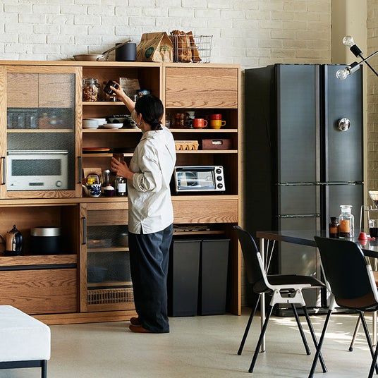 リバースシリーズはOPDBの2サイズ(1200/1400)の他に、600OPダストや400DB(右開き/左開き)もラインナップ。暮らしに合わせて収納をカスタマイズできます。例えば、ゴミ箱やワゴンを収納したい方・家電をたくさん収納したい方は600OPダストを足したり、食器収納を充実させたい方は400DBをプラスしたり。組み合わせ次第で様々な使い方が可能です。