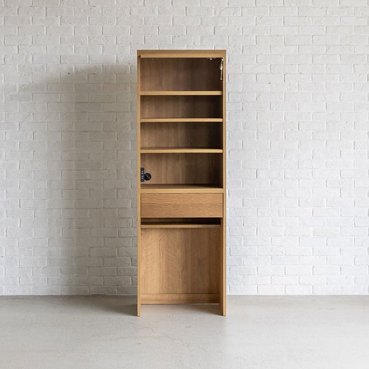 使い勝手に配慮した設計高さは1800mmでコンパクトな設計。日本人女性の平均身長でも上部の収納棚まで届き、取り出しやすい、使い勝手の良い高さです。一般的な冷蔵庫とも同じくらいの高さなので、並べて設置しても違和感なくまとまります。ウレタン塗装のため、毎日のお手入れもふき取るだけで簡単です。