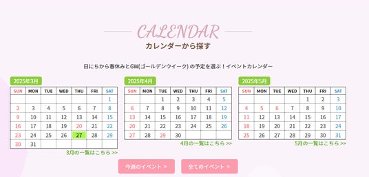 お出かけの日付に合わせてイベントの開催日から検索できる「カレンダーから探す」、子ども向けイベントやフードフェアなどカテゴリー別で検索ができる「カテゴリーから探す」、横浜市内で楽しめるイベントやグルメをジャンル別にまとめた「おすすめの特集」など、この春のお出かけのヒントとなる情報を様々な切り口で紹介しています。