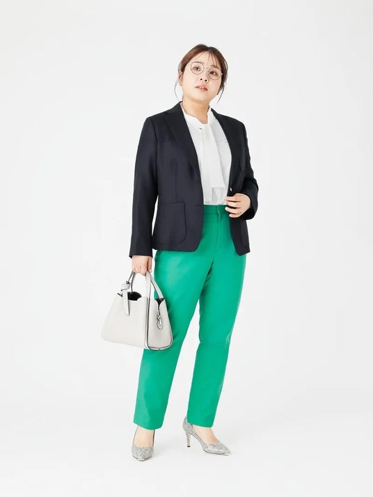 テーパードパンツを合わせてマニッシュな雰囲気に。この春はカラーパンツとのコーディネートで、王道トラッドスタイルにトレンド感を取り入れて!襟元が華やぐボウタイブラウスをインすれば、きちんと見せたいオフィスシーンにも◎