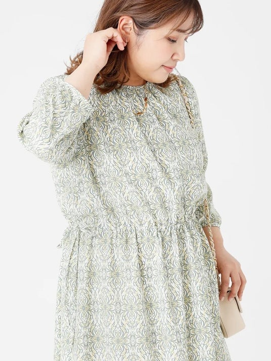 パッと見ると幾何学柄ですが、よく見るとミモザの小花があしらわれている春らしいワンピース。ウエストのリボンを調整することで、シルエットの変化を楽しめます。デートやお食事会など、いつもより少しおしゃれ度をアップしたいシーンにもおすすめです!