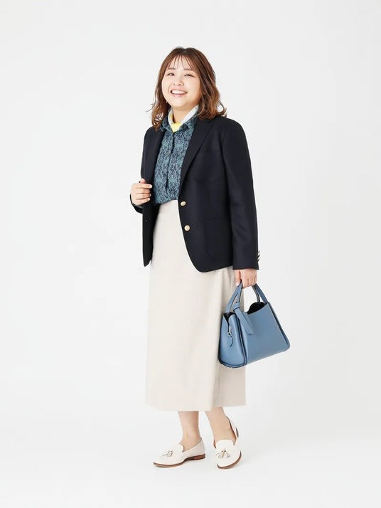 軽い着丈のシングルブレザーは、ストンと落ちるストレートスカートと好相性。縦長に見えるIラインシルエットが上品な着こなしを演出します。フラワーモチーフの幾何柄シャツを合わせて、シックな中にも季節感漂うスタイルに!