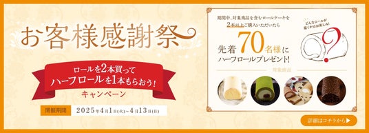 公式通販サイトでは、「堂島ロール×チロリアン」発売を記念して、「お客様感謝祭~冷凍ロール2本買ってハーフサイズを1本もらおう!~」キャンペーンを実施します。