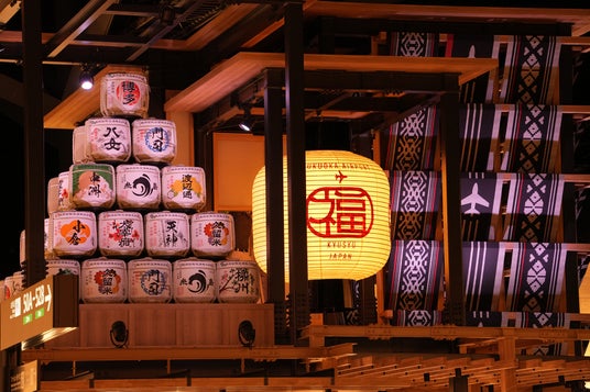 約4倍の広さとなった免税店エリアは「中州の街並み・屋台・祭りの山車」という福岡を象徴する3つの要素を取り入れ、福岡の光景を連想させる空間へと一新。巡った観光名所のひとつとして数えられる場となることを目指し、日本の雰囲気や文化を楽しむことができる空間を創り上げました 。