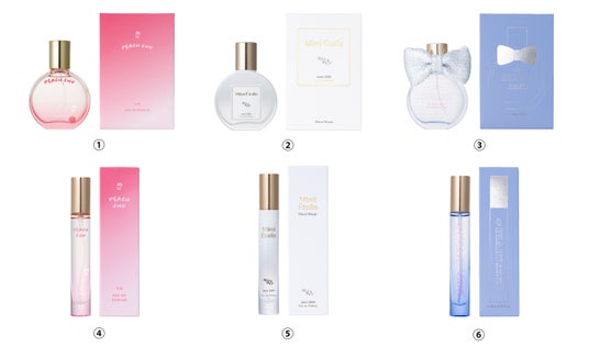 総SNSフォロワー350万人超え※の星乃夢奈さんがプロデュースした香水「ミミ エトワール オードパルファム」は、大人っぽい気品のあるデザインで男女ともに使いやすいフローラルウッディの香り。小学生の頃からインフルエンサーとして活躍しているおさきさんがプロデュースした香水「ダイアリー オードパルファム」は、スパンコールのリボンが特徴で、軽やかで明るいシトラスフローラルの香り。韓国出身の大人気クリエイターちせさんがプロデュースした香水「ピーチ チュー オードパルファム」は、ガラスボトル×手書き風のフォントがかわいい、まろやかでみずみずしいミルキーフルーティの香りです。