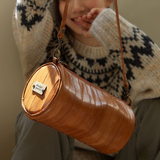 円筒形のショルダーバッグで、側面中央のメタルプレートロゴがポイントです。外側にも内側にもポケットがあるので、小物も収納できます。イールスキンならではの高級感と驚くほどの軽さをお楽しみください。ショルダーストラップ:60cm