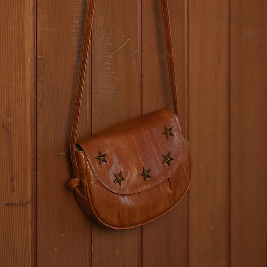 星のメタルパーツが可愛いショルダーバッグです。バッグの開け閉めはマグネットで簡単に。ショルダーストラップもイールスキンで製作しています。ストラップを好きな長さで結ぶことで調節ができます。ショルダーストラップ:最大120cm
