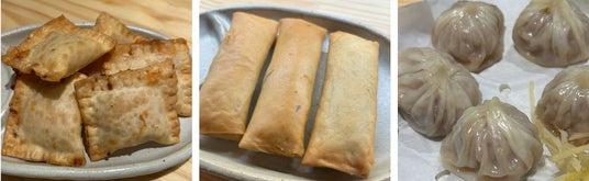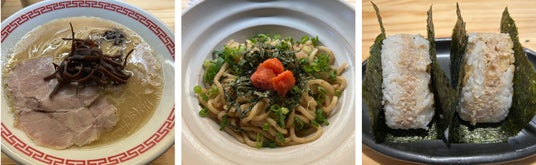 左から、豚骨ラーメン、明太子焼きうどん、おにぎり(チャーシュー味噌/チャーシューマヨネーズ)