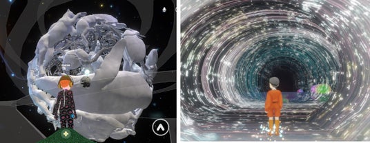 バーチャルパビリオン「いのちめぐる冒険 in Virtual」の1シーン(左)バーチャルパビリオン「Better Co-Being」の「Galaxy」(右)