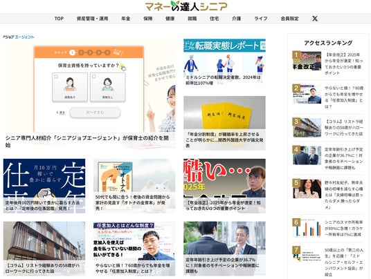 具体的には年金、資産運用/管理、健康、保険、介護、就職、住宅をシニア世代の関心カテゴリーとして分類しつつ、ニュース・コラムを発信。同サイトでしか読むことのできない会員向け記事やセミナーも展開していく予定です。「マネーの達人シニア」は同世代の悩みに寄り添いながら、気になる年金生活の実際や体験談、再就職の現場、成功体験など生の声にフォーカスしていきます。