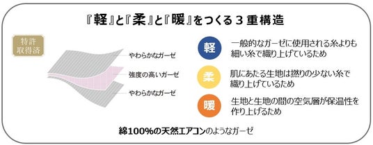 マシュマロガーゼは、UCHINOがタオルの製造技術を最大限にいかして開発した、まるで天然エアコンのような綿100%の特許素材です。通気性、保温性、吸湿・吸水性をバランスよく兼ね備えているマシュマロガーゼは、機能性はもちろんのこと、肌触りの良さも評価され、国内外の10か国で特許を取得しています。マシュマロガーゼを用いた製品は、国内の百貨店、シンガポール高島屋やフランスの老舗高級百貨店「ル・ボン・マルシェ」など海外でも展開され、国内外で高い評価を得ています。
