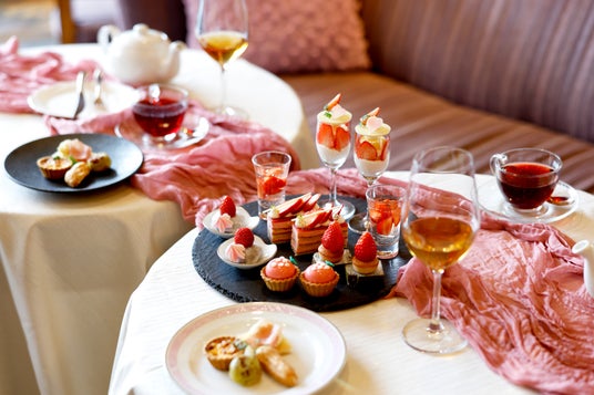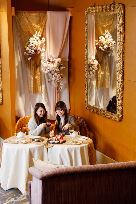 旬のいちごを使用したアフタヌーンティーに、ウェルカムティーとしてワイングラスで嗜む高級茶「ロイヤルブルーティー」、さらにコーヒー・紅茶などのフリーフロー(飲み放題)が付いた期間限定のセットをご用意。ご注文のお客様は、記念撮影にぴったりな華やかな装飾を施した「フォトスポット席」でお召し上がりいただけます。