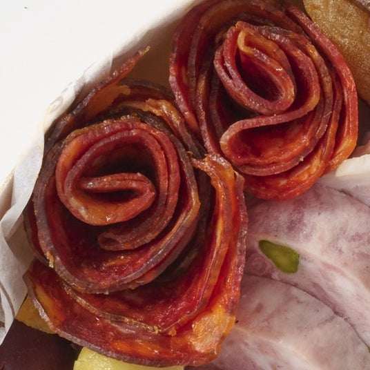 チリペッパーの風味を利かせたイベリコ豚のチョリソで、バラの花を表現しています。