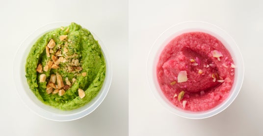 プティポワとケールのフムス&ビーツのフムススプレッドには、大人気のフムスから、プティポワ(グリーンピース)とケールを練り込み、ハーブやレモンで後味爽やかに仕上げた「プティポワとケールのフムス」(写真左)と、ビーツの天然ピンクが色鮮やかな「ビーツのフムス」の2品をセレクト。クセがなくどなたにも好まれる味わいとカラフルな彩りがギフトにぴったりです。