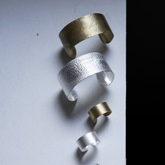ジュエリー制作に欠かせない工具である彫金ローラーを使用して、お好みのテキスタイルの模様を金属の板にプリントします。素材は真鍮と純銀より選んで、リングとバングルのいずれかお好みのアイテムをご制作ください。