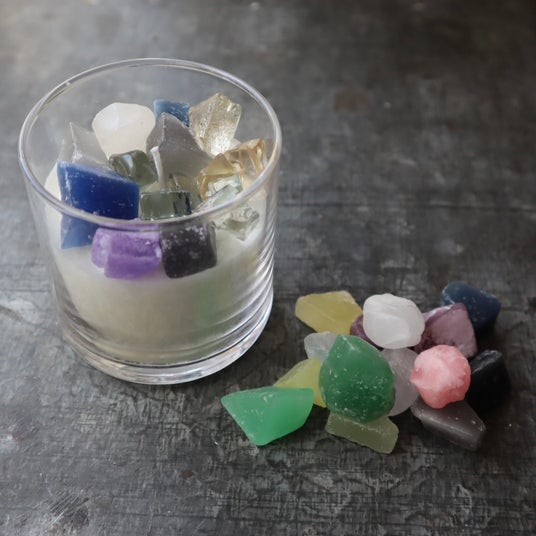 お好きなアロマキャンドルの上に、カラフルな鉱石型のキャンドルを、飾って仕上げるワークショップです。