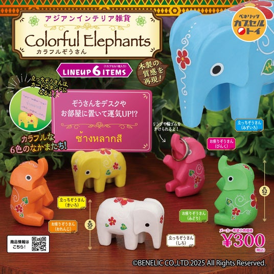ベネリック株式会社(本社:東京都千代田区、社長:横山 武) は、オリジナルカプセルトイの新商品「アジアンインテリア雑貨 カラフルぞうさん」(全6種類 / 1回300円・税込)を2025年3月中旬より順次、全国のカプセルトイ自販機コーナーにて発売いたします。