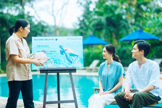 世界自然遺産に登録された西表島(いりおもてじま)で、日本初の「エコツーリズムリゾート」を目指す「西表島ホテル by 星野リゾート」は、2025年6月1日~9月30日の期間、野生のウミガメを観察し、生態について深く学べるアクティビティ「ウミガメディスカバリー」を開催します。世界に生息するウミガメは7種。そのうち3種類が西表島で観察できます。(*1)まずは、ウミガメについて詳しくなれる、「ウミガメの学校」でその生態について学びます。その後、ガイドスタッフと一緒に産卵痕を調査し、実際に海で泳ぐ姿を観察することで、ウミガメについて知り尽くすことができます。