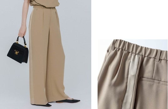 この春のコラボレーションアイテムは、“シンプル&ベーシック”をコンセプトに、光沢感とソフトさが特徴の気品漂うバックサテンジョーゼットを採用したブラウスとパンツを展開し、春を彩る洗練スタイルを提案します。