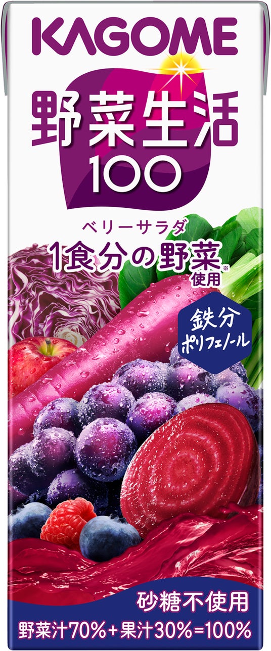 この度、「野菜生活100 オリジナル」「野菜生活100 ベリーサラダ」「野菜生活100 マンゴーサラダ」「野菜生活100 アップルサラダ」の定番4アイテムをリニューアル。