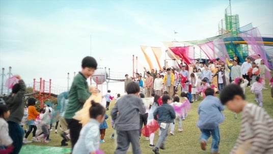 CMの撮影は、丘で歌う劇団ひとりさんを始めとするたくさんの親たちと、それを子どもたちが見守るシーンからスタート。あいにくの曇り空でしたが、たくさんの子どもたちの元気と、そんな大切な子どもたちへの温かい思いが、晴れ渡るようなさわやかな気持ちを呼び寄せてくれました。