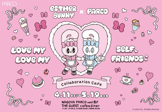 株式会社パルコは、昨年東京・渋谷PARCOにて評判を呼んだ、韓国発の大人気バニーキャラクター「Esther Bunny」(エスターバニー)の世界観を体験できる本格コラボレーションカフェ「EsterBunny×PARCO COLLABORATION CAFE ~LOVE MYSELF,LOVE MY FRIENDS~」を愛知・名古屋PARCO 「THE GUEST cafe&diner」にて2025年4月11日(金)~5月19日(月)の期間、巡回開催いたします。本企画は“LOVE MYSELF,LOVE MY FRIENDS”をコンセプトに、キュートなウェイトレス衣装をまとった限定の描きおろしアートを使用して魅力的で気分が高まるカフェミールやデザート・ドリンクメニューをご提供いたします。この特別なカフェで過ごす時間を通して「わたし自身も、そしてみんなのことも大好きだよ」と、おひとりさまでも、お友達同士や大切な人同士でも、お互いがただそこにいることを認め、称えあえるようなやさしい空間をお届けいたします。