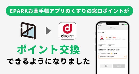 株式会社くすりの窓口(本社:東京都豊島区、代表取締役社長:堤幸治、以下「当社」)は、当社が運用する電子お薬手帳「EPARKお薬手帳アプリ」(https://okusuritecho.epark.jp/renew/、以下「当アプリ」)の利用で貯まる『くすりの窓口ポイント』の交換先として、株式会社NTTドコモが運営する共通ポイントサービス『dポイント』との連携を3月11日(火)から開始いたしました。交換先としてdポイントが選べるだけでなく、新規当アプリ利用者限定で、dポイント最大10,000pt相当に交換ができるくすりの窓口ポイントを抽選でプレゼントするキャンペーンも開始いたしました。