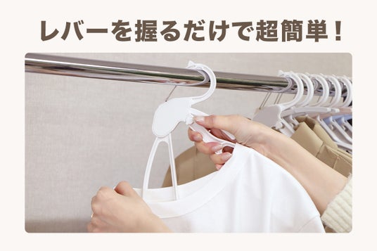 レバーを握ることでハンガーが折り畳まれるので、首元を引っ張ることなくハンガーから服を着脱することが可能です。レバーから手を離せばハンガーは通常の形に戻ります。この技術は国際特許も申請中です。