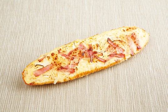 フランスパンにホワイトソース・タマネギ・ベーコンをのせて焼き上げました。カルボナーラ風の旨味がぎゅっと詰まったイタリアンテイストのフランスパン。