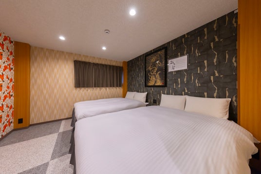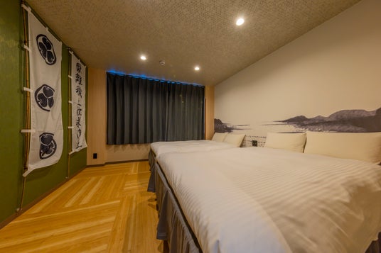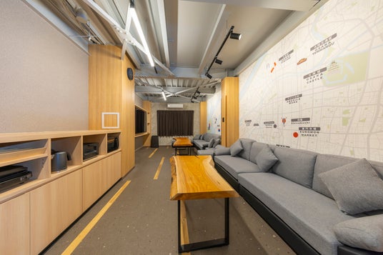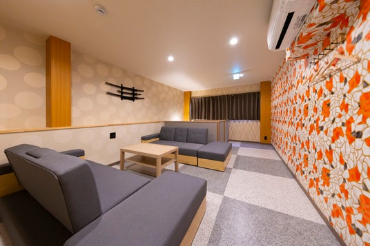 広々としたソファが並ぶリビングスペース。壁には大阪の観光マップをデザインし、旅の計画もその場で楽しめる空間に。スマートTVを搭載した大型テレビとブルーレイプレーヤーも設置しており、映像コンテンツも存分にお楽しみいただけます。