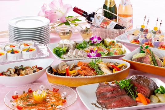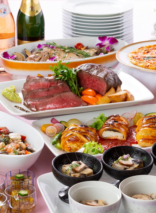 オードブルバリエ/和前菜2種盛り合わせ/中華冷製2種盛り合わせ/鮮魚の南蛮漬/サラダバー/ミックスサンドとナンピザ/サーモンと海老の生春巻き/バラちらし寿司/三元豚ロース冷しゃぶと冷やしうどん/季節野菜のムース 小海老とコンソメジュレ添え/麻婆春雨/鶏もも肉の唐揚げとポテトフライ/野菜の天ぷら盛り合わせ/白身魚のムニエル アロマソース/中華風小海老炒め/牛すじ煮込みのパイ包み焼き/五目焼きそば/季節野菜と蒸し豚/桜海老と春野菜のペペロンチーノ/手羽元と野菜のトマト煮込み/ポークカレー/本日のスープ/お子様ハンバーグ/パティシエお任せデザート盛り合わせ/季節のフルーツ盛り合わせ