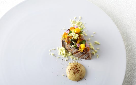 コースはTHE RAYのシグネチャーメニューである、あたたかみのある清水焼天目茶碗でご提供するスープに始まり、前菜にはほのかに炙った鰹に、香り高い焼きナスやフルーティーな甘さの枇杷を合わせた、旬が彩る一品をご用意。シェフのこだわりが詰まった品々で、五感に響く食体験をお楽しみいただけます。