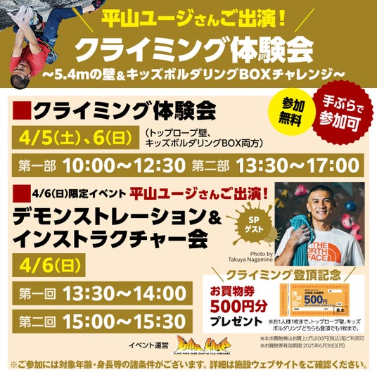 4月6日(日)限定で国内で30年以上トップクライマーとして活躍した、世界の平山ユージがデモンストレーション&インストラクチャー会を実施します。