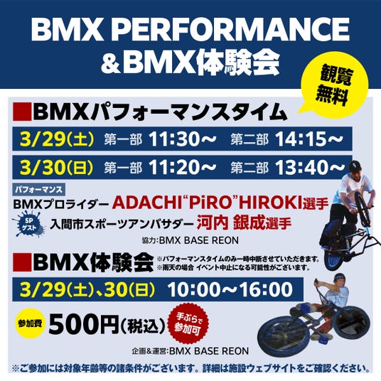 2.BMX PERFORMANCE&BMX体験会:3月29日(土)~3月30日(日)