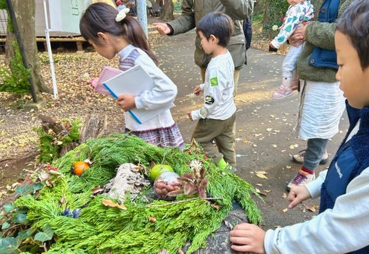 来訪者が森の中で見つけた小さな宝物(木の実や葉など)を持ち寄り、その景色に新たな価値を添えていきます。誰かが美しいと思って置いたそれを、また他の誰かも美しいと感じる。そうした積み重ねの中で、森の隅々が大切にされ、自然と人々との新しい関係性が生まれていきます。