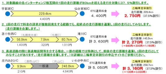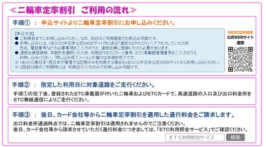 東日本高速道路株式会社、中日本高速道路株式会社、西日本高速道路株式会社(以下、「NEXCO三社」という。)及び宮城県道路公社は、令和7年4月5日(土)より、土日・祝日にNEXCO三社及び宮城県道路公社が管理する高速道路をご利用するETC二輪車を対象に、料金を定率で割り引く「二輪車定率割引」を実施します。